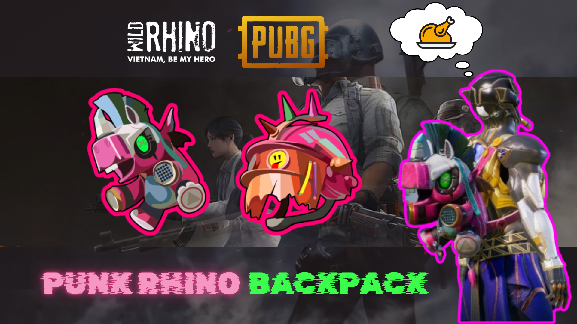 Punk Rhino Backpack đơn giản là một chiếc ba lô sinh tồn trong PUBG được diện vẻ ngoài của một chú tê giác gai góc mang phong cách thường thấy ở những người đam mê Punk Rock. Punk Rhino Backpack đi kèm với Ragtag Goon Helmet trong sự kiện battle pass mùa 16 của tựa game này.
