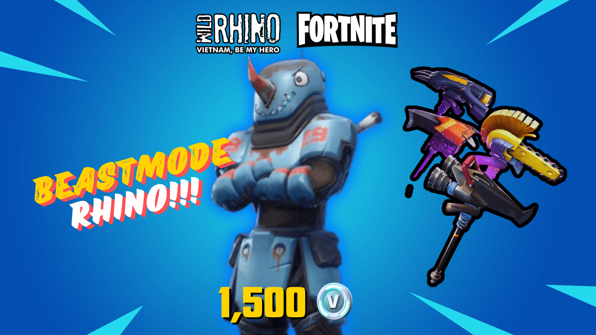 Beastmode là skin Sử Thi mà bạn có thể mua với giá 1500 V-bucks trong hệ thống cửa hàng vật phẩm của tựa game Fortnite. Một trong số ngoại hình mà người chơi có thể chọn là Rhino, một bộ giáp cơ học màu xanh-đen có số hiệu 29 với chiếc mũ hình tê giác tô điểm bởi chiếc sừng đỏ bắt mắt!