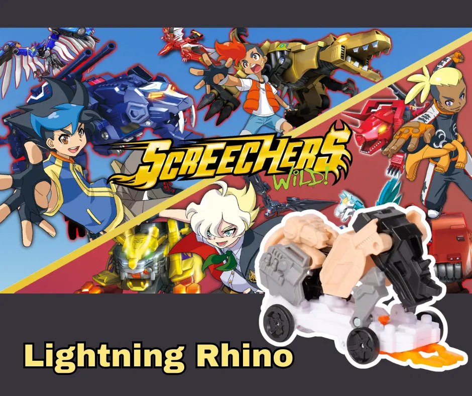 Screechers Wild! là một series hoạt hình Trung Quốc ra mắt năm 2018, lấy bối cảnh một thế giới nơi các phương tiện có thể biến hình thành sinh vật mạnh mẽ nhờ năng lượng đặc biệt gọi là “Screecher Discs”. Lightning Rhino – Một trong những Screechers mạnh mẽ nhất, có khả năng biến hình từ xe tải thành một con tê giác bọc thép với tốc độ cực nhanh và sức công phá đáng kinh ngạc. Lightning Rhino đóng vai trò quan trọng trong các trận chiến, giúp phe chính diện giành lợi thế trước kẻ thù.