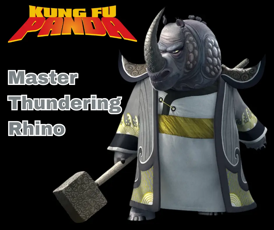 Thundering Rhino được rèn dũa với người cha Flying Rhino, một huyền thoại Kung Fu. Dù chỉ được giới thiệu sơ qua trong phim, nhưng các fan ai cũng đều có ấn tượng mạnh mẽ đến bộ giáp hầm hố mà ông đã mặc trong trận chiến chống quân thù tại tỉnh Quảng Đông.