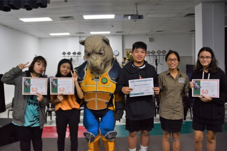 Các học sinh đạt giải cấp 1 và 2 của trường quốc tế Hà Nội tại Việt Nam nhận phần thưởng từ Kiểm Lâm Tê Giác và Thư Huỳnh, nhân viên của tổ chức Wilderness Foundation Africa tại Việt Nam.