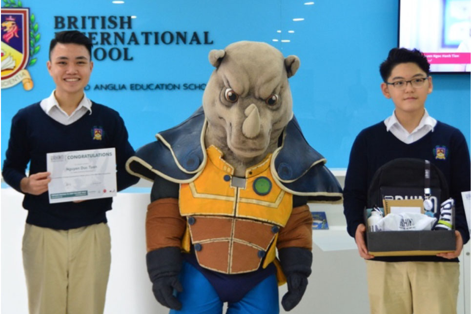 Các học sinh chiến thắng cuộc thi của chiến dịch Wild Rhino từ trường quốc tế Anh (BIS) tại Hà Nội nhận phần thưởng từ Kiểm Lâm Tê Giác.