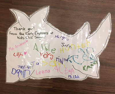 Thư Huỳnh, đại diện của Forever Wild Rhino tại Thành phố Hồ Chí Minh, vừa được mời đến trường Mầm non Saigon Kids Club để giúp các bé tìm hiểu về tê giác. Một giáo án tương tác cũng được soạn để nâng cao nhận thức của các bé về tê giác, và ngoài ra các bé được nghe câu chuyện về cô bé tê giác tên Hope. Hãy nhấp vào liên kết bên dưới để đọc câu chuyện về Hope.