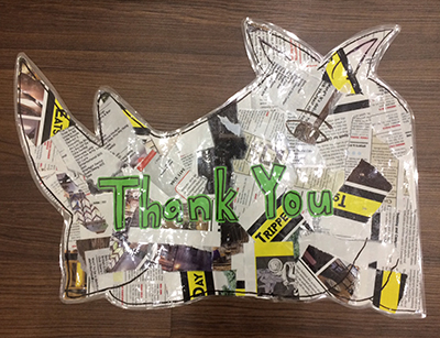 Những bé nhỏ thích tô màu và tạo ra một thông điệp cảm ơn tuyệt đẹp trên một con tê giác được cắt ra.