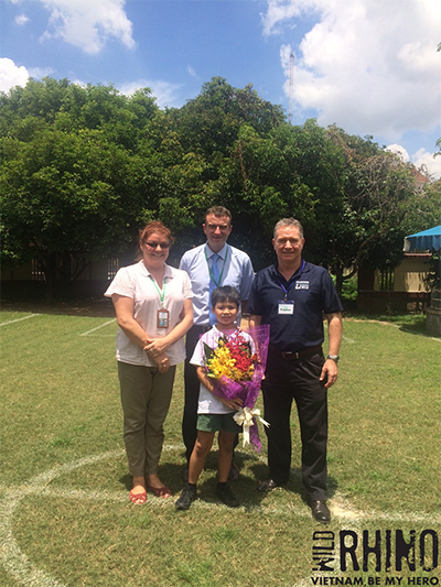 WILD RHINO 1 – Các học sinh đạt giải cấp 1 và cấp 2 của Trường Quốc tế ABC tại Thành phố Hồ Chí Minh nhận giải từ Kiểm Lâm Tê Giác và Thư Huỳnh, nhân viên của tổ chức Wilderness Foundation Africa tại Việt Nam.