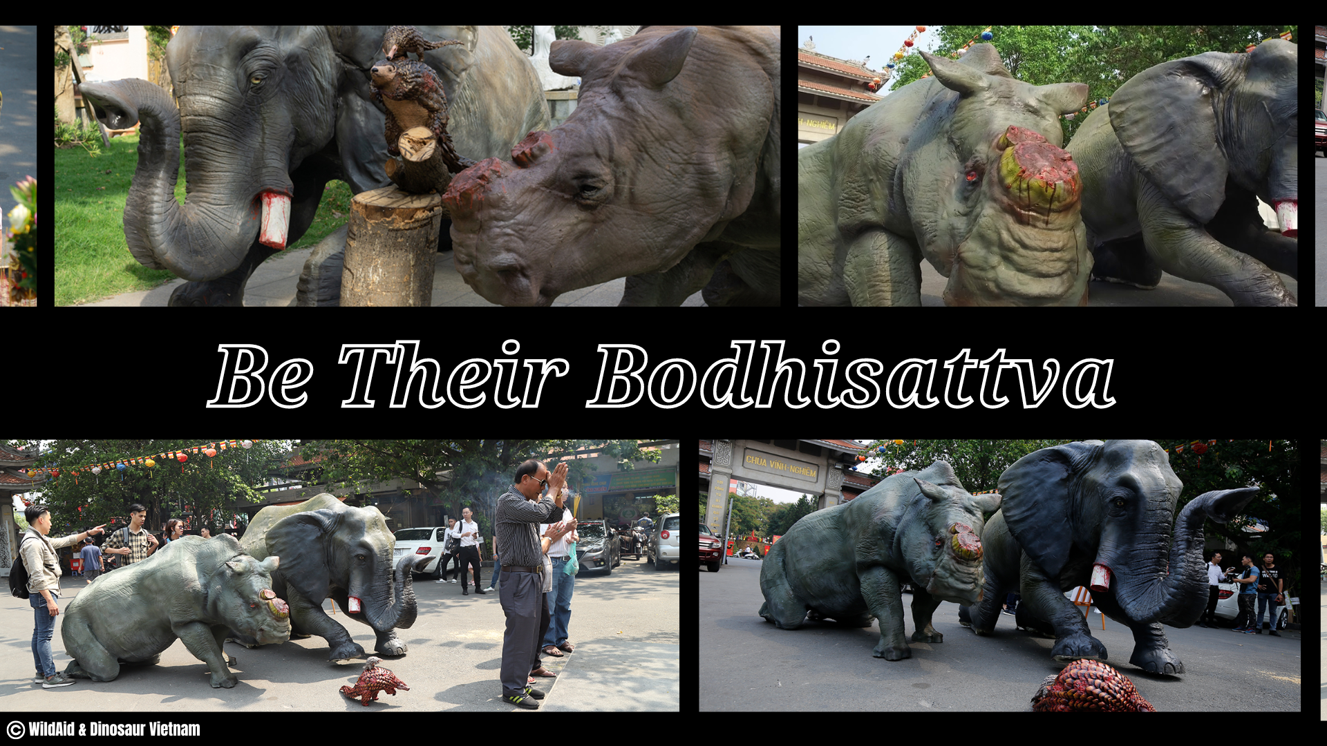 “Hãy là Bồ Tát của chúng” – Một chiến dịch năm 2019 của WildAid nhằm nâng cao nhận thức của cộng đồng trong vấn đề bảo tồn tê giác nói riêng và ĐVHD nói chung tại Việt Nam. Những tượng tê giác mất sừng, voi mất ngà, hay tê tê bị lột da được tạo tác cách công phu, đầy sống động và đặt trước Chùa Vĩnh Nghiêm, TP. HCM thể hiện tình cảnh các loài vật trên đang đối mặt. Trong thời gian các bức tượng trên còn hiện hữu ở chùa, người dân đã đến chụp hình và ngẫm nghĩ về số phận của những loài ĐVHD tại mảnh đất hình chữ S.